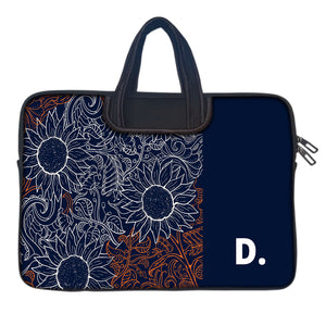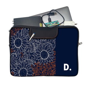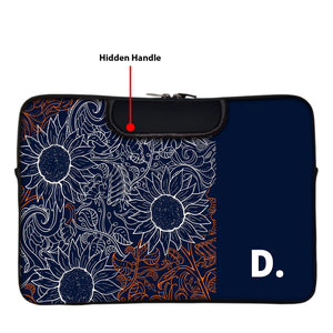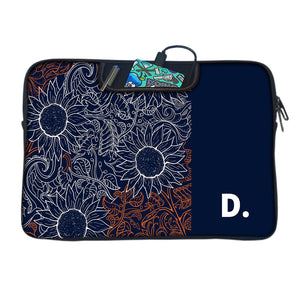A modern interplay of sunflowers and swirling leaves, etched in intricate white and fiery orange linework. Set against a deep navy canvas, the design balances wild energy with bold minimalism. Finished with a personalized initial — a quiet nod to individuality in a sea of detail.